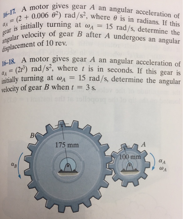 . Ask Expert 1 See Answers. A motor gives gear A an angular acceleration of α A 4 t 3 rad s 2 where t is in seconds. A motor gives gear A an angular acceleration of α A 2 t 3 alpha_A2 t3 α A 2 t 3 rads 2 2 2 where t is in seconds.